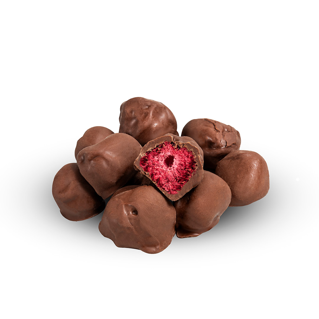 Framboesa e Amora Liofilizados são frutas que passaram por um processo especial para remover a maior parte da água deles. Isso é feito para preservar o sabor e os nutrientes das frutas, tornando-os leves, crocantes e fáceis de armazenas. Pense neles como morango que foram cuidadosamente `enxugados´ para que você possa desfrutar do sabor da Framboesa e da Amora com uma cobertura de chocolate. Uma explosão de sabor.